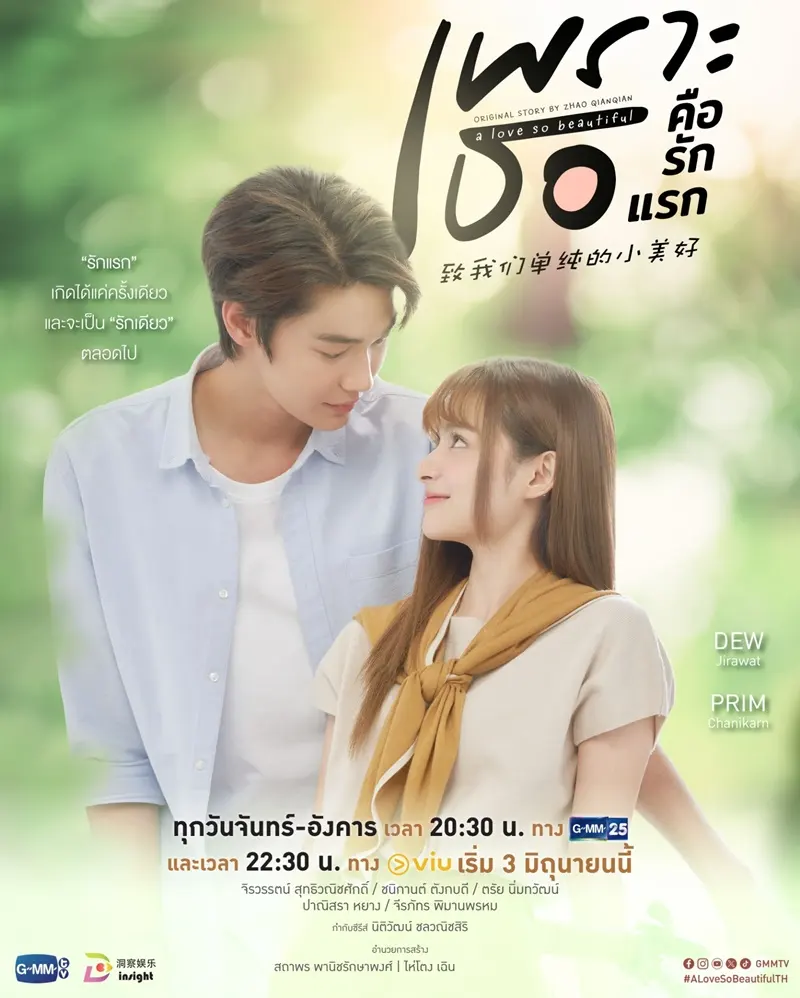 เมื่อ ส้มโอ (พรีม ชนิกานต์) และ ชัดเจน (ดิว จิรวรรตน์) อยู่บ้านติดกันตั้งแต่เด็ก ทั้งสองจะไปรอขึ้นรถโรงเรียนด้วยกัน ได้เรียนห้องเดียวกัน ทำให้ทั้งสองคนสนิทกันตั้งแต่เด็ก วันหนึ่งพ่อของชัดเจนเสียชีวิต ส่วนแม่แต่งงานใหม่และย้ายตามสามีใหม่ไปฝรั่งเศส แต่ชัดเจนไม่อยากย้ายไปด้วย แม่จึงฝากชัดเจนไว้กับบ้านข้าง ๆ นั่นก็คือบ้านส้มโอ พอเข้าช่วงมัธยม ส้มโอและชัดเจนก็ได้รู้จักเพื่อนกลุ่มใหม่ ๆ รวมถึง นิว (เป็นต่อ จีรภัทร) และ ข้าว (เอ็มม่า ปาณิสรา) ทั้งสองคนเป็นเพื่อนที่น่ารักมาก คอยให้คำปรึกษาและช่วยเหลือส้มโอในเรื่องความรักอยู่เสมอ อยู่มาวันหนึ่งก็มีเด็กใหม่เข้ามา ดีกรีนักกีฬาว่ายน้ำ เขาชื่อว่า เต๋า (นีโอ ตรัย) ทุกคนร่วมผ่านร้อนผ่านหนาวมาด้วยกัน ไม่ว่าจะเป็นการเรียน กิจกรรม จนทำให้กลายเป็นเพื่อนกลุ่มเดียวกันในที่สุด หลายปีผ่านไป เข้าสู่ช่วงมหาลัย ทุกคนต่างแยกย้ายไปเรียนตามคณะของตัวเอง แต่ก็ยังอยู่ในมหาลัยเดียวกัน ส่วนเต๋าก็ทำตามความฝันของตัวเองโดยการเป็นนักกีฬาว่ายน้ำ หลังจากที่ส้มโอกับชัดเจนได้ใช้เวลาอยู่ด้วยกันมากขึ้น จนดูเหมือนทุกอย่างกำลังจะไปได้ด้วยดี แต่กลับแย่ลงกว่าเดิม จนทำให้ส้มโอรู้สึกว่าทั้งสองต่างไม่มีเวลาให้กัน รวมถึงเหตุการณ์สำคัญที่ส้มโอขอความช่วยเหลือ แต่ชัดเจนก็ยังคงไม่ว่างเพราะเป็นหมอ จึงทำให้ทั้งคนตัดสินใจแยกทางกัน เรื่องราวของรักแรกนั้นจะจบลงอย่างไร ส้มโอ-ชัดเจน จะได้กลับมาเป็นรักแรกของกันและกันอีกไหม มาลุ้นกันต่อได้ในซีรีส์ เพราะเธอคือรักแรก A Love So Beautiful