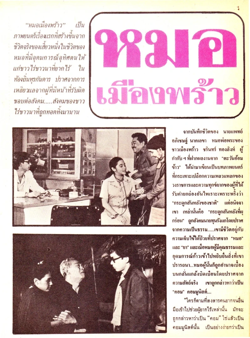 หมอเมืองพร้าว (2522/1979) ข้อความบนใบปิด วรพินภาพยนตร์ โดย วรพิน รัตนาพรรณ เสนอ หมอเมืองพร้าว จากชีวิตจริงของ...น.พ.อภิเชษฐ์ นาคเลขา เรื่องของหมอ ผู้มีอุดมการณ์สูงส่ง ยอมละทิ้งชื่อเสียง ฐานะ ความร่ำรวย ก้าวตามเสียงเรียกของมนุษยธรรม สู่ดินแดนแร้นแค้นที่ความศิวิไลซ์หันหลังให้ ขอแนะนำพระเอกบัณฑิตนิติศาสตร์จากจุฬาฯ มานิตย์ มัสยวานิช นันทนา เงากระจ่าง วิยะดา อุมารินทร์ กาญจนา บุญประเสริฐ กฤษณ์ เนาวกานต์, วุฒิ คงคาเขตร, นภาพร หงสกุล, ม.ล.โกมล ปราโมช, ธรรมนูญ จันทโรจน์วงศ์ ลิขิต กฤษณมิตร ถ่ายภาพ วรพิน รัตนาพรรณ อำนวยการสร้าง ชรินทร์ ทองสิงห์ เขียนบท และ กำกับการแสดง นิวไฟว์สตาร์ จัดจำหน่าย ชื่อ : หมอเมืองพร้าว Name : - ผลิตโดย : วรพินภาพยนตร์ จัดจำหน่าย : นิวไฟว์สตาร์ วันที่เข้าฉาย : 25 สิงหาคม 2522 หมอเมืองพร้าว (2522) ใบปิดวาดโดย SUPERTEEMหมอเมืองพร้าว (2522) เรื่องย่อ 1/6หมอเมืองพร้าว (2522) เรื่องย่อ 2/6หมอเมืองพร้าว (2522) เรื่องย่อ 3/6หมอเมืองพร้าว (2522) เรื่องย่อ 4/6หมอเมืองพร้าว (2522) เรื่องย่อ 5/6หมอเมืองพร้าว (2522) เรื่องย่อ 6/6 *ที่มา :Thai Movie Posters