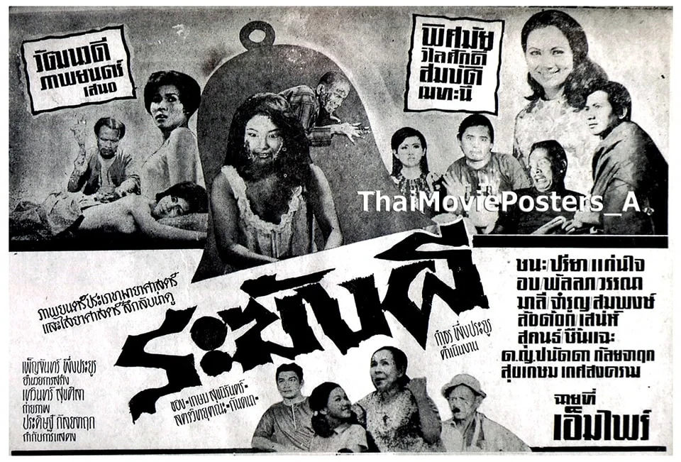 ระฆังผี (2511/1968) หมู่บ้านแห่งหนึ่ง มีผู้ใหญ่คล้าย (อบ บุญติด) เป็นผู้ปกครองหมู่บ้าน ส่วนเมียผู้ใหญ่คล้ายนั้นเสียชีวิตไปแล้ว ผู้ใหญ่คล้ายจึงมีเมียใหม่เป็นสาวรุ่นๆ ชื่อว่า ลำดวน (แก่นใจ มีนะกนิษฐ์) แต่ลำดวนกลับคิดไม่ซื่อกับผู้ใหญ่คล้าย หวังจะครอบครองทรัพย์สมบัติของผู้ใหญ่จึงลอบเป็นชู้กับนายอั๋น (ชนะ ศรีอุบล) หลานแท้ๆ ของผู้ใหญ่คล้ายเพื่อหวังจะให้นายอั๋นช่วยหาทางกำจัดผู้ใหญ่คล้ายไปโดยเร็ว ต่อมาผู้ใหญ่คล้ายเป็นประธานหล่อระฆังวัดประจำหมู่บ้าน จึงเรียกตัวลูกสาว 2 คน คนโตชื่อ เพ็ญ (พิศมัย วิไลศักดิ์) คนเล็กชื่อ พร (ด.ญ.ปนัดดา กัลย์จาฤก) กลับจากกรุงเทพฯ เพื่อมาทำบุญร่วมกันซึ่งลำดวนก็ไม่ค่อยสบายใจนักเกรงว่าสองพี่น้องจะมาแย่งทรัพย์สมบัติจากตนไป นายอั๋นกับลำดวนจึงสบโอกาสที่จะฆ่าผู้ใหญ่คล้ายโดยวางแผนอย่างแยบยลให้ดูเหมือนว่าผู้ใหญ่คล้ายเดินพลาดตกไปตายในเต้าหลอมระฆังเอง ซึ่งเมื่อเกิดเหตุการณ์นั้นจริง ก็ไม่มีใครคิดว่าจะเป็นเรื่องของการฆาตกรรมแต่อย่างไรเพราะคิดว่าเป็นอุบัติเหตุ หลังการตายของผู้ใหญ่คล้าย ทางการก็แต่งตั้งนายอั๋นขึ้นเป็นผู้ใหญ่บ้านแทน นายอั๋นหวังจะเคลมเพ็ญเป็นเมียอีกคน ทั้งๆ ที่นายอั๋นมีเมียลับๆ อยู่อีกคนคือ ดอกไม้ (ปรียา รุ่งเรือง) ซึ่งกำลังตั้งท้องใกล้จะคลอด ต่อมาทางการก็ส่ง โชค ชนะชล (แอ๊ด สมบัติ เมทะนี) นายตำรวจปลอมตัวมาสืบจับคนร้าย โชคเข้าไปตีสนิทจนได้เป็นมือปืนของผู้ใหญ่อั๋น ช่วงนี้ ผีผู้ใหญ่คล้ายเริ่มออกอาละวาดชาวบ้านที่หากินไม่สุจริตจนผู้ใหญ่อั๋นต้องหาพระดีๆ มาห้อยคอ ฝ่ายผีผู้ใหญ่คล้ายรู้ว่านายอั๋นกำลังคิดร้ายกับเพ็ญจึงมาบอกเพ็ญให้รู้ตัว ขณะที่โชคเองก็เริ่มได้เบาะแสความชั่วของผู้ใหญ่อั๋นบ้างแล้วและโชคยังได้ช่วยปกป้องเพ็ญกับน้องสาวให้พ้นมือผู้ใหญ่อั๋นด้วย ฝ่ายดอกไม้เมื่อท้องแก่มากๆ ก็ตื้อให้ผู้ใหญ่อั๋นรับผิดชอบแต่งงาน ผู้ใหญ่รำคาญจึงสั่งลูกน้องไปฆ่าดอกไม้และเผากระท่อมทิ้ง ส่วนลำดวนก็หาทางกำจัดเพ็ญกับน้องสาวเพื่อหวังได้ทรัพย์สมบัติ แต่โชคก็มาช่วยเหลือได้ทัน ขณะที่ผีผู้ใหญ่คล้ายกับผีนางดอกไม้ก็ออกอาละวาดหนักขึ้นแต่ทำอะไรผู้ใหญ่อั๋นไม่ได้เพราะมีพระดีห้อยคอ ชาวบ้านหาหมอผีมาปราบผี แต่ก็สู้ผีสองผีนี้ไม่ได้ ต่อมาเมื่อได้ความแน่ชัดว่า ผู้ใหญ่อั๋นทำผิดกฎหมายบ้านเมือง ตำรวจจึงลงมือปราบปราม เกิดการยิงต่อสู้กันและในระหว่างที่ผู้ใหญ่อั๋นหลบหนีนั้น พระที่ห้อยคอก็หลุดหายไป ผีผู้ใหญ่คล้ายซึ่งรอเวลาอยู่แล้ว ก็ปรากฏตัวขึ้นมาฆ่าผู้ใหญ่อั๋นตาย 