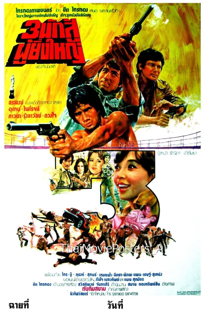 3 นักสู้ผู้ยิ่งใหญ่ (2519/1976) เสี่ยเคี้ยงมีลูกน้องมาก ชอบรังควานชาวบ้านและเป็นคู่อริกับพ่อเลี้ยงยัน จอมเป็นลูกน้องของพ่อเลี้ยง มาอยู่กับพ่อเลี้ยงพร้อมกับ สีทองซึ่งเป็นเมีย ต่อมาเมียของจอมถูกฆ่า จอมจึงออกตามหาฆาตกรด้วยตัวเอง ด้านพ่อเลี้ยงจับได้ว่าเมียมีชู้กับลูกน้องที่ชื่อ โรจน์ ชื่อ : 3 นักสู้ผู้ยิ่งใหญ่ Name : - ผลิตโดย : ไทรทองภาพยนตร์ จัดจำหน่าย : นิวไฟว์สตาร์ วันที่เข้าฉาย : 10 สิงหาคม 2519 3 นักสู้ผู้ยิ่งใหญ่ (2519) ใบปิดวาดโดย ทองดี ภานุมาศ *ที่มา :Thai Movie Posters