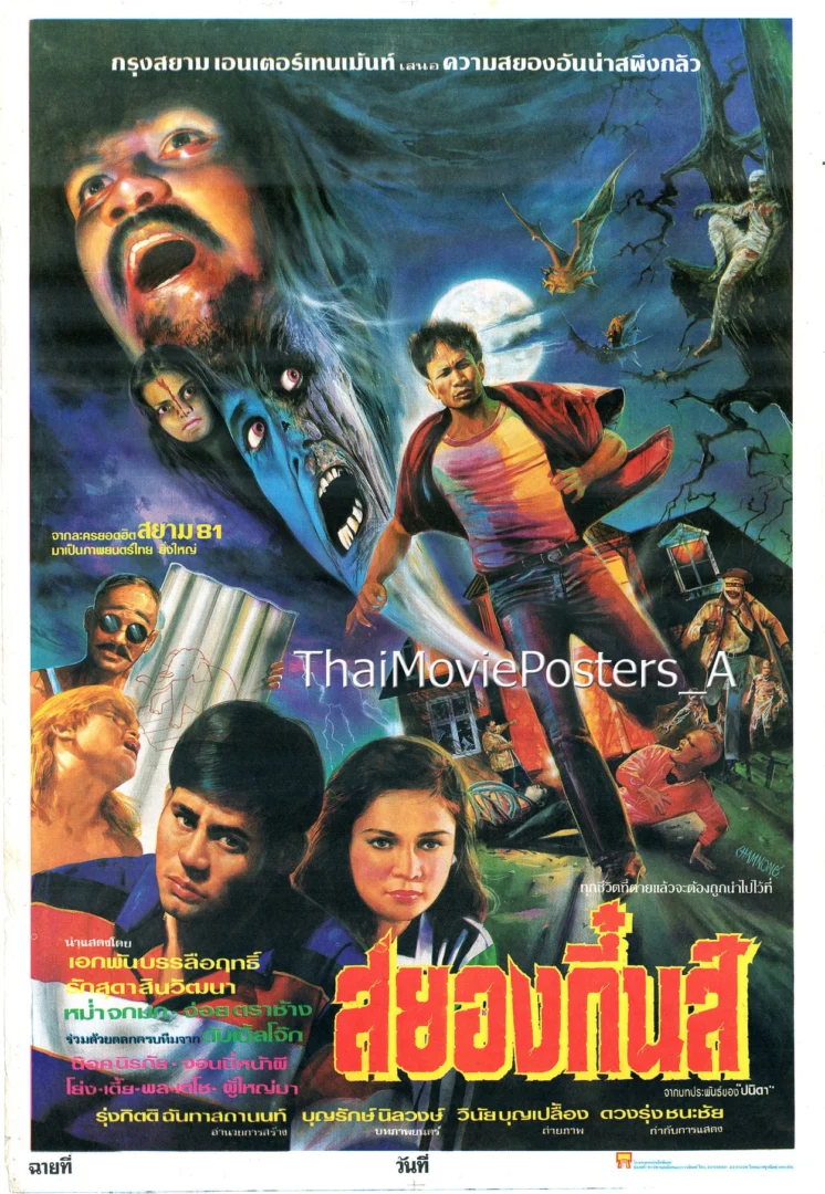 สยองกึ๋นส์ (2536/1993) เอกพัน-รักษ์สุดา ข้อตวามบนใบปิด กรุงสยามเอนเตอร์เทนเม้นท์ ความสยองอันน่าสะพรึงกลัว จากละครยอดฮิต สยาม 81 มาเป็นภาพยนตร์ยิ่งใหญ่ ทุกชีวิตที่ตายแล้วจะต้องถูกนำไปไว้ที่ สยองกึ๋นส์ จากบทประพันธ์ของ “ปนิตา” นำแสดงโดย เอกพัน บันลือฤทธิ์, รักษ์สุดา สินวัฒนา หม่ำ จ๊กมก, จ่อยตราช้าง ร่วมด้วยตลกครบทีมจาก ดับเบิ้ลโจ๊ก น๊อค นิรภัย, จอนนี่ หน้าผี, โย่ง, เตี้ย, พล, เดโช, ผู้ใหญ่มา รุ่งกิตติ ฉันทาสถานนท์ อำนวยการสร้าง บุญรักษ์ นิลวงษ์ บทภาพยนตร์ วินัย บุญเปลื้อง ถ่ายภาพ ดวงรุ่ง ชนะชัย กำกับารแสดง