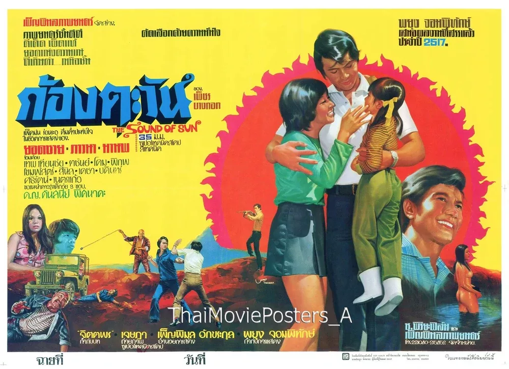 ก้องตะวัน (2517/1974) ข้อความบนใบปิด เพ็ญพิมลภาพยนตร์ จัดสร้าง ภาพยนตร์ชั้นดีที่ดีเด็ด เผ็ดแท้ ยอดแห่งความแน่ ที่เกินค่า...เหนือชั้น พยุง จอมพิทักษ์ เสนอผลงานที่สรรแล้วประจำปี 2517 คัดเลือกด้วยความมั่นใจ ก้องตะวัน THE SOUND OF SUN ของ เพ็ชร บางกอก ซูเปอร์เทคนิคสโคป สีเทคนิค เผ็ดมัน ร้อนระอุ ดื่มด่ำประทับใจ ในชีวิตการแสดงของ (ยอดชาย เมฆสุวรรณ) (ภาวนา ชนะจิต) (มานพ อัศวเทพ) ร่วมด้วย เทพ เทียนชัย, ราชันย์ กาญจนมาศ, โดม สิงห์โมฬี, พิภพ ภู่ภิญโญ, โขมพัสตร์ อรรถยา, สีนิล, เดชา, บดินทร์, ศธิรัตน์, เนตรแก้ว ขอแนะนำดาวรุ่งเด็กวัย 3 ขวบ ด.ญ.ศันสนีย์ พิศนาคะ “จิตตพร” กำกับบท เจษฎา ถ่ายภาพซูเปอร์เทคนิคสโคป เพ็ญพิมล อักขระกุล อำนวยการสร้าง พยุง จอมพิทักษ์ กำกับการแสดง ช.พิริยะฟิล์ม และ เพ็ญพิมลภาพยนตร์ จัดจำหน่าย