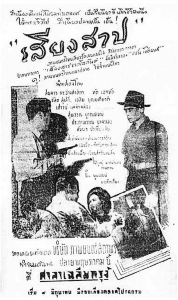 เสียงสาป (2496/1953) สำเนียงนั้นแผ่วโผยมาในอากาศ เป็นสำเนียงที่พลิกชีวิตหนึ่งให้กระเจิงไป ...สำเนียงประหลาดนั้น เป็น! "เสียงสาป" (ที่มา: หนังสือพิมพ์รายวัน สยามรัฐ 4 มิถุนายน พ.ศ. 2496)