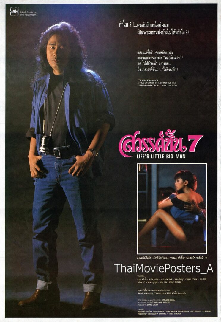สวรรค์ชั้น 7 (2533/1990) ข้อความบนใบปิด เอ็กซิทฟิล์ม โปรดักชั่น เสนอ ทำไม! คนอัปลักษณ์อย่างผม เป็นพระเอกหนังบ้างไม่ได้หรือไง?! และผมเชื่อว่า...คุณหล่อกว่าผม แต่คุณบางคนอาจจะ “หล่อล้มเหลว”! แต่ “อัปลักษณ์” อย่างผม ถึง “สวรรค์ชั้น 7 ”...”ไม่อิจฉารึ”! YOU WILL EXPERIENCE A TRUE LIFESTYLE OF A GROTESQUE MAN EXTRODINARY CRAZE!…AND…SADISTIC! สวรรค์ชั้น 7 LIFE’S LITTLE BIG MAN คุณจะได้สัมผัส..ลีลาชีวิตจริงของ...”ทรนง ศรีเชื้อ” “แปลกบ้า-ซาดิสม์” !?! นำแสดงโดย ทรนง ศรีเชื้อ ดาริน กรสกุล เดชา เสนาวัฒน์, นีน่า สิโยธญา, ไอลดา ชารีมาห์, ลิตา รัชนี, วิเวียน ระวี, ตะนะ กุลบุตร, ทิชา ราณี, สปันตา ราโชมอน ทรนง ศรีเชื้อ..บทประพันธ์-บทภาพยนตร์-กำกับการแสดง พิพัฒน์ พยัคฆะ-มนู วรรณายก...ถ่ายภาพ ศิราณี ศรีเชื้อ...อำนวยการสร้าง