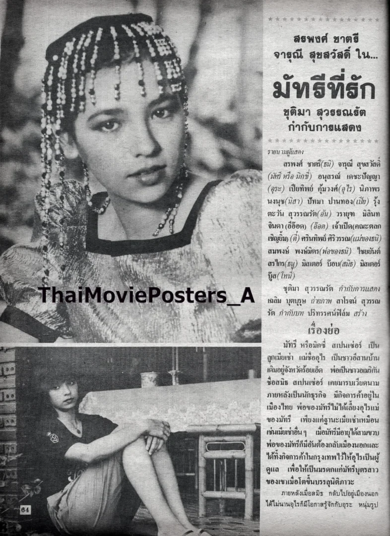 มัทรีที่รัก (2526/1983) ข้อความบนใบปิด ชุติมา สุวรรณรัต มอบให้...จารุณี สุขสวัสดิ์... รับบทเฉียบขาดทุกรส..สวย..เก่งกล้า..ฮา..ประทับใจ มัทรีที่รัก ชุติมา สุวรรณรัต กำกับการแสดง สรพงศ์ ชาตรี จารุณี สุขสวัสดิ์ พบพระเอกจอแก้ว อนุสรณ์ เดชะปัญญา นิภาพร นงนุช, ปัทมา ปานทอง, เปียทิพย์ คุ้มวงศ์, วิยะดา อุมารินทร์, รุ้งตะวัน สุวรรณรัต, (ศรินทิพย์ ศิริวรรณ), สมพงษ์ พงษ์มิตร, ธัญญา โพธิ์วิจิตร, วรายุฑ มิลินทจินดา (อีอ๊อด) สาโรจน์ สุวรรณรัต กำกับบท เฉลิม บุตรบุรุษ ถ่ายภาพ พรพรรณ สุวรรณทัต อำนวยการสร้าง ปริทรรศน์ฟิล์ม จัดจำหน่าย