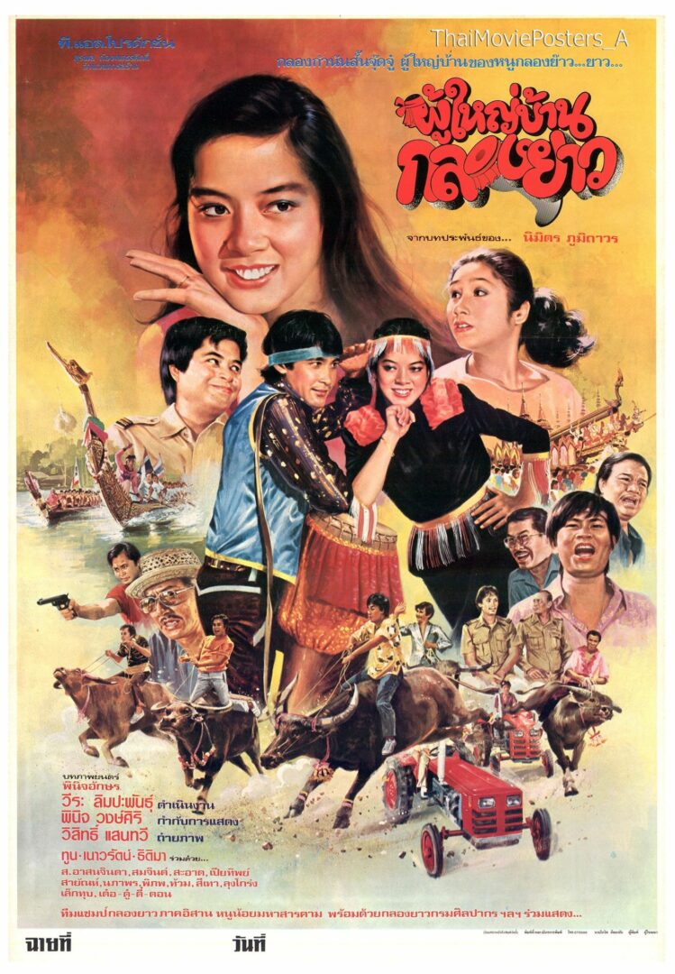 ผู้ใหญ่บ้านกลองยาว (2526/1983) ข้อความบนใบปิด พี.แอล.โปรดักชั่น สุรพล ก้องเพชรศักดิ์ อำนวยการสร้าง กลองกำนันสั้นจุ๊ดจู๋ ผู้ใหญ่บ้านของหนูกลองย๊าว...ยาว... ผู้ใหญ่บ้านกลองยาว จากบทประพันธ์ของ...นิมิตร ภูมิถาวร ทูน หิรัญทรัพย์ เนาวรัตน์ ยุกตะนันท์ (ธิติมา สังขพิทักษ์) ร่วมด้วย...ส.อาสนจินดา, สมจินต์ ธรรมทัต, สะอาด เปี่ยมพงษ์สานต์, เปียทิพย์ คุ้มวงศ์, (สายัณห์ จันทรวิบูลย์), นภาพร หงสกุล, พิภพ ภู่ภิญโญ, ท้วม ทรนง, สีเทา, ลุงโกร่ง กางเกงแดง, เล็กทุบ, เด๋อ-ดู๋-ดี๋-ดอน ทีมแชมป์กลองยาวภาคอีสาน หนูน้อยมหาสารคาม พร้อมด้วยกลองยาวกรมศิลปากร ฯลฯ ร่วมแสดง... พินิจอักษร บทภาพยนตร์ วีระ ลิมปะพันธุ์ ดำเนินงาน พินิจ วงษ์ศิริ กำกับการแสดง วิสิทธิ์ แสนทวี ถ่ายภาพ