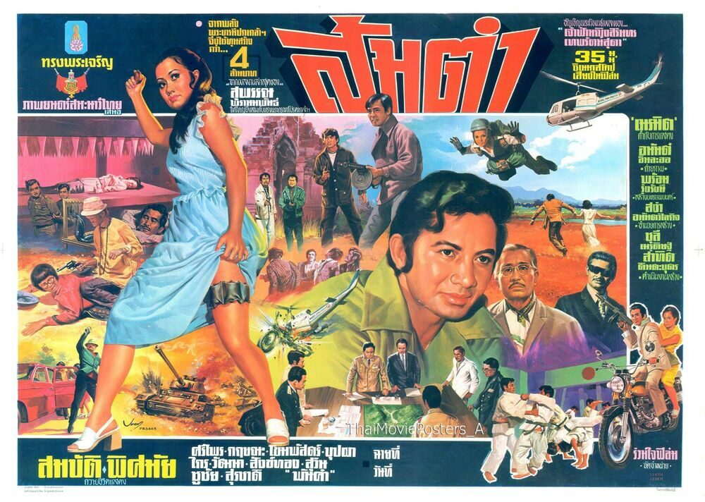ส้มตำ (2516/1973) ข้อความบนใบปิด ทรงพระเจริญ ภาพยนตร์สหะนาวีไทย เสนอ จากพลังพระบารมีปกเกล้าฯ จึงใช้ทุนสร้างกว่า..4 ล้านบาท จากผลงานล่าสุดของ สุพรรณ พราหมณ์พันธุ์ ให้ยิ่งใหญ่สมกับพระกรุณาโปรดเกล้าฯ ส้มตำ อัญเชิญพระราชนิพนธ์เพลงของ..”เจ้าฟ้าหญิงสิรินทรเทพรัตนสุดา” 35 ม.ม.ซีเนมาสโคป เสียงในฟิล์ม (แอ๊ด สมบัติ เมทะนี) (พิศมัย วิไลศักดิ์) ถวายชีวิตแสดง ศรีไพร ใจพระ, กฤษณะ อำนวยพร, โขมพัสตร์ อรรถยา, บุปผา สายชล, ไกร ครรชิต, วัฒนา กีชานนท์, สังข์ทอง สีใส, (สุวิน สว่างรัตน์), ชูชัย, สุรชาติ ไตรโภค, “พันคำ” “เนรมิต” กำกับการแสดง อนันต์ อินละออ ถ่ายภาพ พร้อม รุ่งรังษี สร้างบทภาพยนตร์ สง่า อนันตวิไลกิจ อำนวยการสร้าง ชุลี เมรุดิษฐ์-สาทิต ตินตะบุตร ดำเนินงานสร้าง ร่วมใจฟิล์ม จัดจำหน่าย