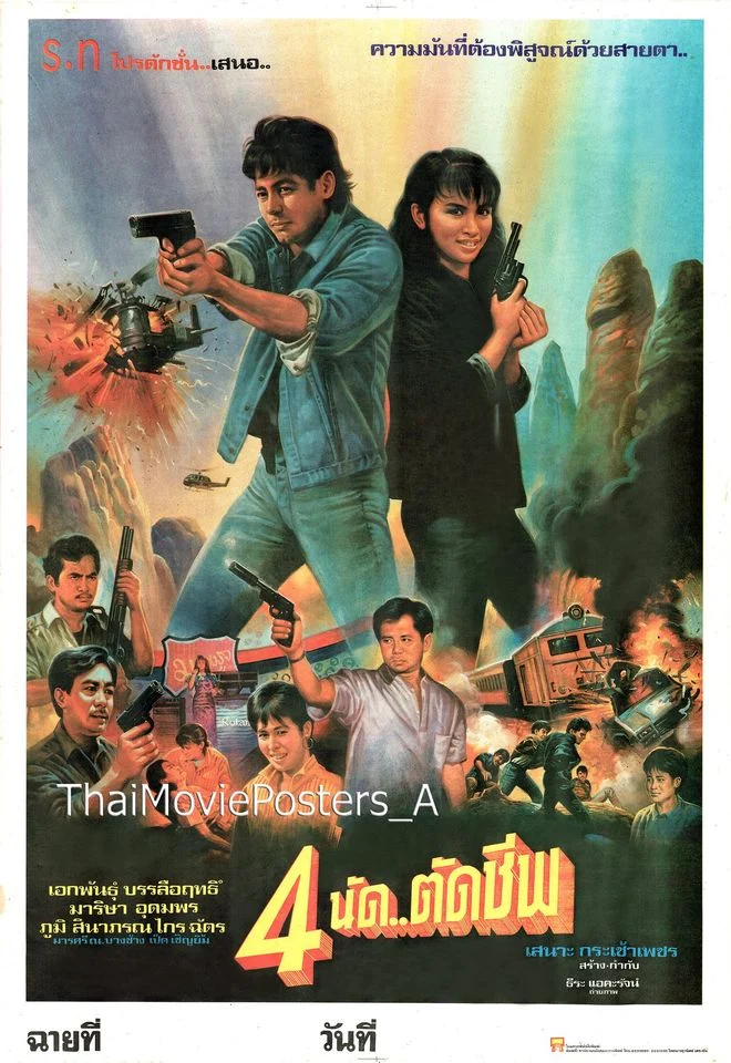 4 นัด..ตัดชีพ (2531/1988) ข้อความบนใบปิด ร.ท.โปรดักชั่น เสนอ... ความมันที่ต้องพิสูจน์ด้วยสายตา... 4 นัดตัดชีพ เอกพัน บันลือฤทธิ์ มาริษา อุดทพร ภูมิ พัฒนายุทธ, สินาภรณ์ พิไลลักษณ์, ไกร ครรชิต, ฉัตร มงคลชัย, มารศรี ณ บางช้าง, เป็ด เชิญยิ้ม เสนาะ กระเช้าเพชร สร้าง-กำกับ ธีระ แอคะรัจน์ ถ่ายภาพ