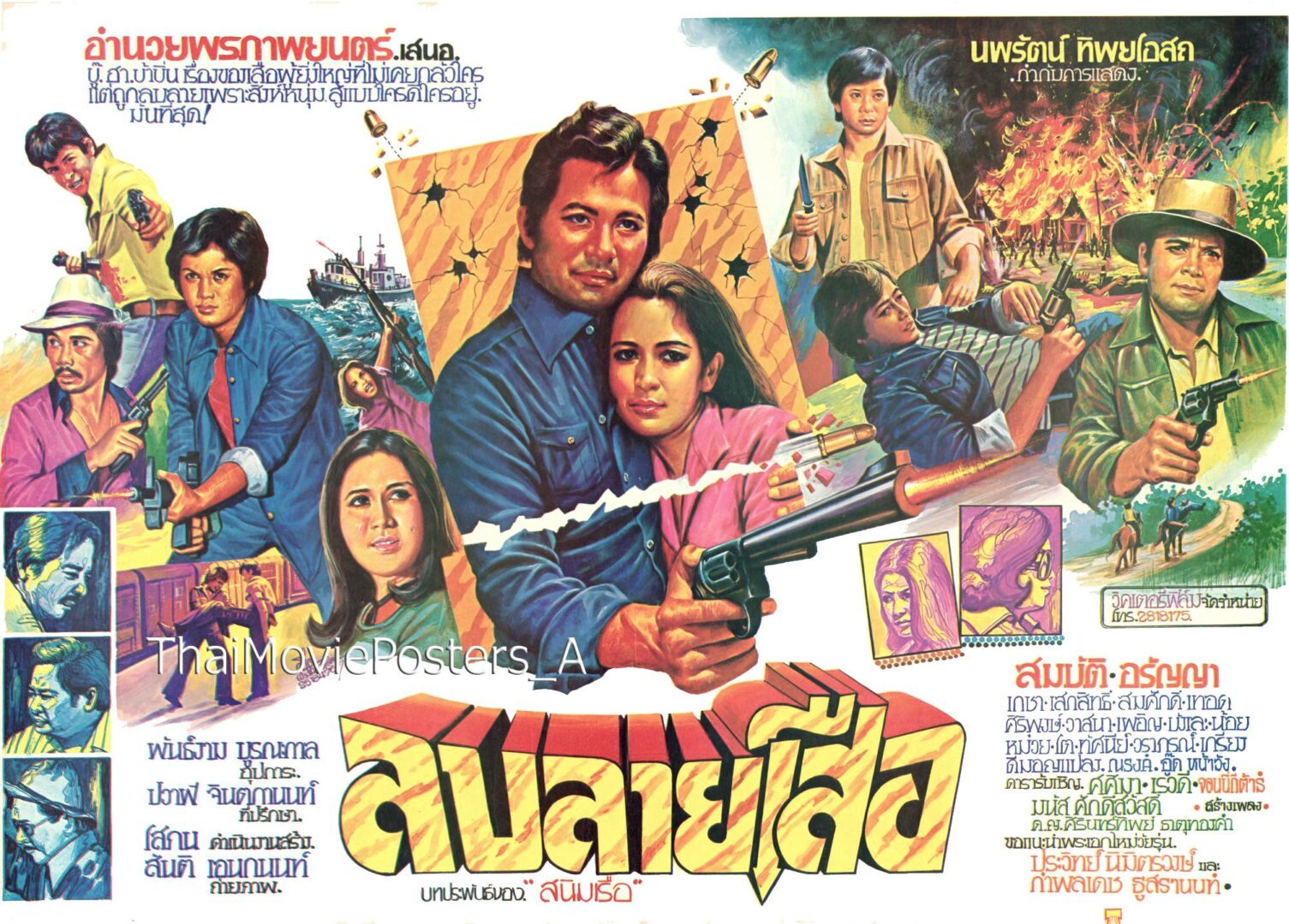 ลบลายเสือ (2521/1978) ข้อความบนใบปิด อำนวยพรภาพยนตร์ เสนอ บู๊..ฮา..บ้าบิ่น เรื่องของเสือผู้ยิ่งใหญ่ที่ไม่เคยกลัวใคร แต่ถูกลบลายเพราะสิงห์หนุ่ม สู้แบบใครดีใครอยู่ มันที่สุด! ลบลายเสือ บทประพันธ์ของ “สนิมเรือ” (แอ๊ด สมบัติ เมทะนี) (เปี๊ยก อรัญญา นามวงศ์) (เกชา เปลี่ยนวิถี), เสกสิทธิ์ สวัสดิรักษ์, (สมศักดิ์ ชัยสงคราม), เทอด ดาวไท, ศิริพงษ์ อิศรางกูร, วาสนา ชลากร, เผอิย, บังเละน้อย, หมวย, โต, ทัศนีย์, วราภรณ์, เกรียง, ดีมอญแปลง, ณรงค์, อู๊ด หน้าวัง ดารารับเชิญ ศศิมา สิงห์ศิริ, เรวดี ปัตตะพงษ์, มนัส ศักดิ์สวัสดิ์, ด.ญ.ศิรินทร์ทิพยื ธาตุทองคำ ขอแนะนำพระเอกวัยรุ่น ประวิทย์ นิมิตรวงษ์ และ กำพลเดช ธูสรานนท์ จอนนี่กีต้าร์ สร้างเพลง พันธ์งาม บูรณกาล อุปการะ ปวาฬ จินตกานนท์ ที่ปรึกษา โสภณ ดำเนินงานสร้าง สันติ เอนกนนท์ ถ่ายภาพ นพรัตน์ ทิพยโอสถ กำกับการแสดง วิคเตอรี่ฟิล์ม จัดจำหน่าย ชื่อ : ลบลายเสือ Name : - ผลิตโดย : อำนวยพรภาพยนตร์ จัดจำหน่าย : วิคตอรี่ฟิล์ม วันที่เข้าฉาย : 2521 ลบลายเสือ (2521) ใบปิดวาดโดย ณีต *ที่มา :Thai Movie Posters