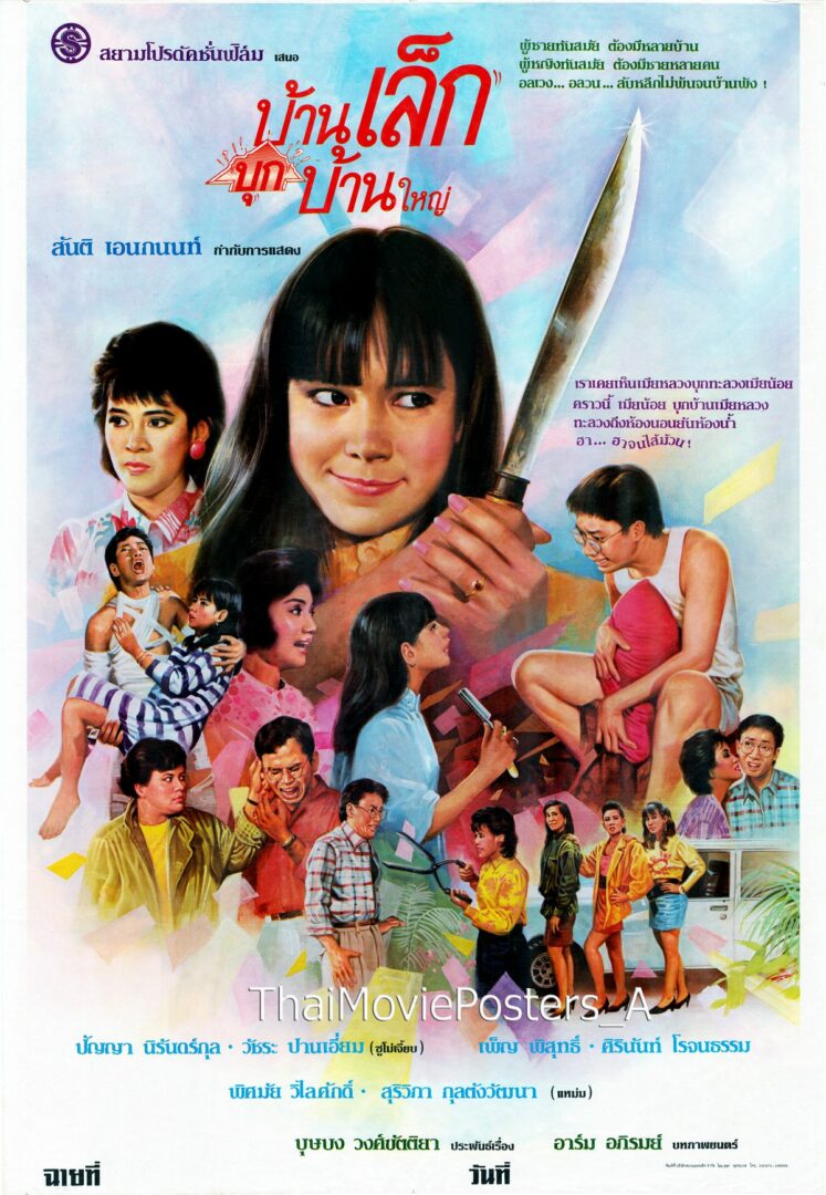 บ้านเล็กบุกบ้านใหญ่ (2531/1988) ข้อความบนใบปิด สยามโปรดักชั่นฟิล์ม เสนอ ผู้ชายทันสมัย ต้องมีหลายบ้าน ผู้หญิงทันสมัย ต้องมีชายหลายคน อลเวง...อลวน...สับหลีกไม่พ้นจนบ้านพัง! เราเคยเห็นเมียหลวงบุกทะลวงเมียน้อย คราวนี้ เมียน้อย บุกบ้านเมียหลวง ทะลวงถึงห้องนอนยันห้องน้ำ ฮา..ฮาจนไส้ม้วน! บ้านเล็กบุกบ้านใหญ่ สันติ อเนกนนท์ กำกับการแสดง ปัญญา นิรันดร์กุล วัชระ ปานเอี่ยม (ซูโม่เจี๊ยบ) เพ็ญ พิสุทธิ์ ศิรินันท์ โรจนธรรม (พิศมัย วิไลศักดิ์) สุริวิภา กุลตังวัฒนา (แหม่ม) บุษบง วงศ์ขัตติยา ประพันธ์เรื่อง อาร์ม อภิรมย์ บทภาพยนตร์