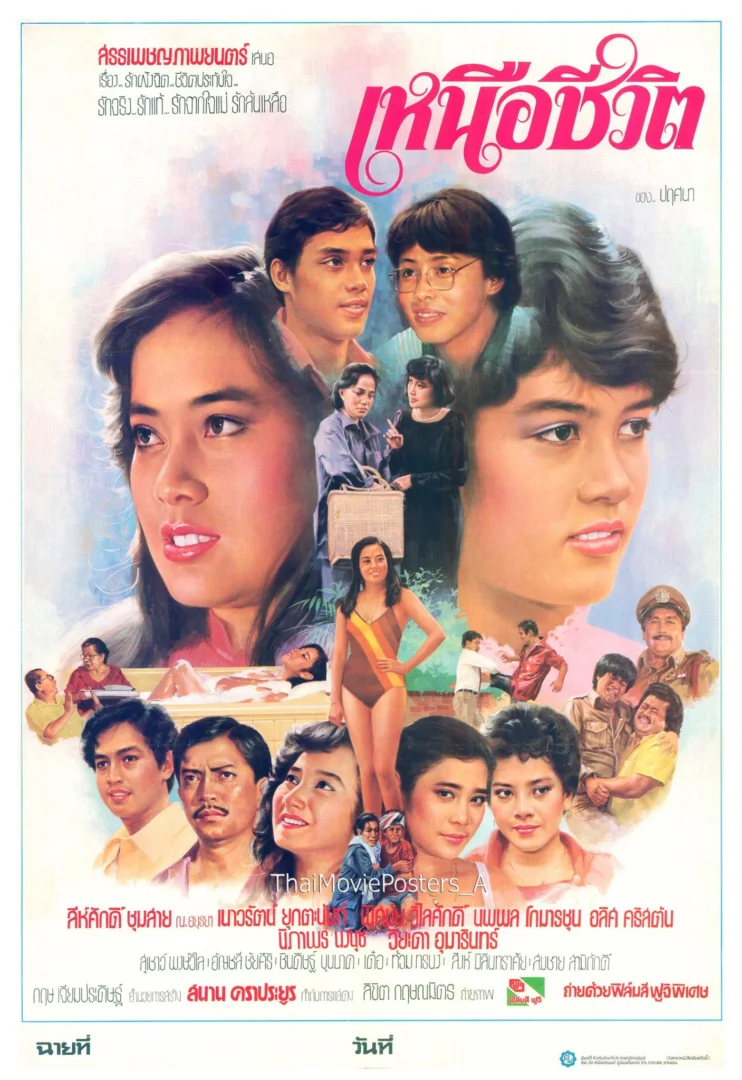 เหนือชีวิต (2525/1982) ข้อความใบนใบปิด สรรเพชญภาพยนตร์ เสนอ เรื่อง...รักฝังจิต...ชีวิตประทับใจ.. รักจริง...รักแท้...รักจากใจแม่...รักล้นเหลือ เหนือชีวิต ของ ปฤศนา สีหศักดิ์ ชุมสาย ณ อยุธยา เนาวรัตน์ ยุกตะนันท์ (พิศมัย วิไลศักดิ์) นพพล โกมารชุน อลิศ คริสตัน นิภาพร นงนุช วิยะดา อุมารินทร์ สุเชาว์ พงษ์วิไล, อัญชลี ชัยศิริ, ชินดิษฐ์ บุนนาค, เด๋อ ดอกสะเดา, ท้วม ทรนง, สิงห์ มิลินทราศัย, (สมชาย สามิภักดิ์) กฤษ เจียมประดิษฐ์ อำนวยการสร้าง สนาน คราประยูร กำกับการแสดง ลิขิต กฤษณมิตร ถ่ายภาพ ถ่ายด้วยฟิล์มสีฟูจิพิเศษ