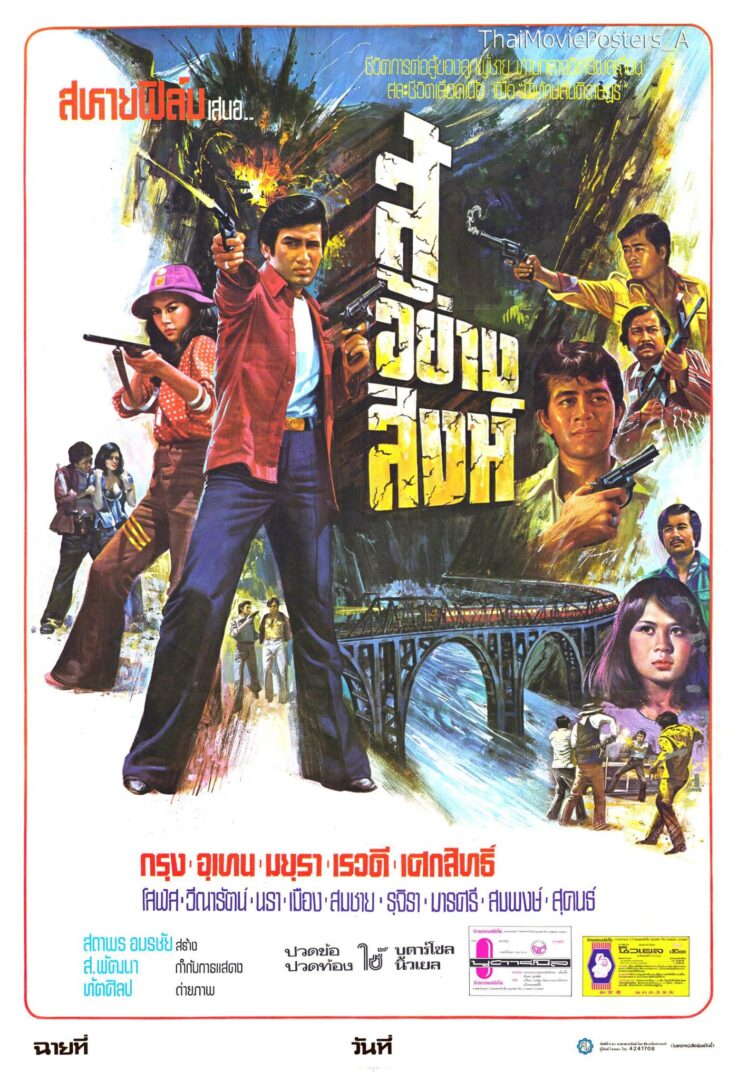 สู้อย่างสิงห์ (2523/1980) ข้อความบนใบปิด สหายฟิล์ม เสนอ... ชีวิตการต่อสู้ของลูกผู้ชาย ท่ามกลางอิทธิพลเถื่อน สละชีวิตเลือดเนื้อ เพื่อ “พิทักษ์สันติราษฎร์” สู้อย่างสิงห์ (กรุง ศรีวิไล) (อุเทน บุญยงค์) มยุรา ธนะบุตร เรวดี ปัตตะพงษ์ เศกสิทธิ์ สวัสดิรักษ์ โสฬส, วีณารัตน์, นรา นพนิรันดร์, เมือง อพอลโล่, (สมชาย สามิภักดิ์), รุจิรา-มารศรี อิศรางกูร, สมพงษ์ พงษ์มิตร, (สุคนธ์ คิ้วเหลี่ยม) สถาพร อมรชัย สร้าง ส.พัฒนา กำกับการแสดง ทัตศิลป ถ่ายภาพ