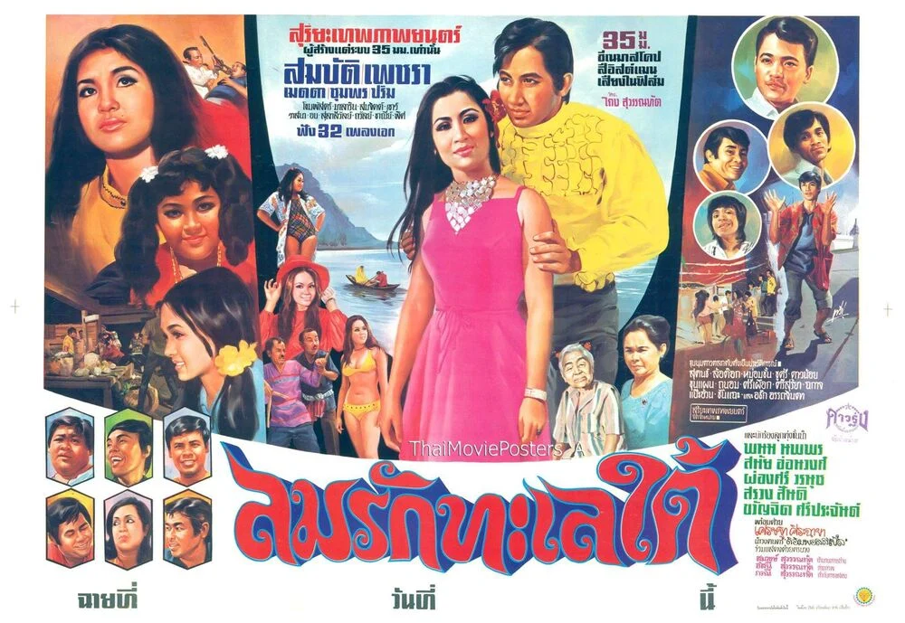 ลมรักทะเลใต้ (2514/1971) ข้อความบนใบปิด สุริยะเทพภาพยนตร์ ผู้สร้างแต่ระบบ 35 ม.ม.เท่านั้น (แอ๊ด สมบัติ เมทะนี) (อี๊ด เพชรา เชาวราษฎร์) (เมตตา รุ่งรัตน์), (ชุมพร เทพพิทักษ์), ปริม ประภาพร, โขมพัสตร์ อรรถยา, มาลาริน บุนนาค, (สมจิตร ทรัพย์สำรวย), เชาว์ แคล่วคล่อง, วาสนา ชลากร, อบ บุญติด, สุลาลีวัลย์ สุวรรณทัต, ถวัลย์ คีรีวัต, ชาห์ณี ยอดชัย, พิศ ฟัง 32 เพลงเอก 35 ม.ม.ซีเนมาสโคป สีอิสต์แมน เสียงในฟิล์ม โดย ไถง สุวรรณทัต ลมรักทะเลใต้ ชุมนุมดาวตลกคับคั่งเป็นประวัติการณ์ (สุคนธ์ คิ้วเหลี่ยม), (ล้อต๊อก), (หม่อมชั้น พวงวัน), (ชูศรี มีสมมนต์), ดาวน้อย ดวงใหญ่, ขุนแผน, ถนอม นวลอนันต์, สีเผือก, ศรีสุริยา, ฉกาจ, แป๊ะอ้วน, ชื้นแฉะ และ อธึก อรรถจินดา และนักร้องลูกทุ่งชั้นนำ (พนม นพพร), สมัย อ่อนวงศ์, ผ่องศรี วรนุช, สรวง สันติ, ขวัญจิต ศรีประจันต์ พร้อมด้วย (ต้อย เศรษฐา ศิระฉายา)นำวงดนตรี “ดิอิมพอสสิเบิ้ล” ร่วมแสดงด้วยครบวง สมวงษ์ สุวรรณทัต อำนวยการสร้าง อัสนี สุวรรณทัต ถ่ายภาพ ภรณี สุวรรณทัต กำกับการแสดง สุริยะเทพภาพยนตร์ จัดจำหน่าย (ที่มา :Thai Movie Posters)