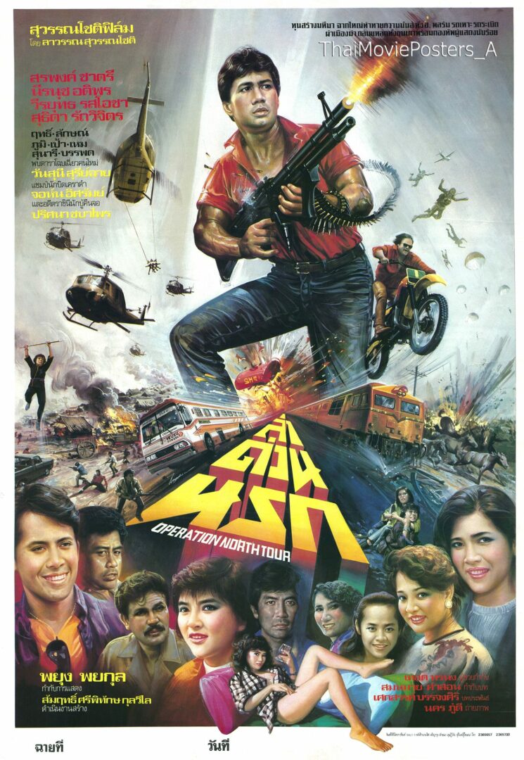 ล่าด่วนนรก (2529/1986) ข้อความบนใบปิด สุวรรณโชติฟิล์ม โดย ลาวรรณ สุวรรณโชติ ทุนสร้างมหึมา ฉากใหญ่ท้าทายความมันส์ ทั้งฮ. พลร่ม รถเหาะ รถระเบิด ผ่าเมืองฆ่า ถล่มแหลกทั้งขุนเขา พร้อมกองทัพผู้แสดงนับร้อย ล่าด่วนนรก OPERATION NORTH TOUR สรพงศ์ ชาตรี นีรนุช อติพร วีระยุทธ รสโอชา สุธิดา รัถวิจิตร ฤทธิ์ ลือชา, ลักษณ์ อภิชาติ, ภูมิ พัฒนายุทธ, เป้า, เหม, สุนารี, บรรพต พบดาราโฉบเฉี่ยวคนใหม่ วันสุนี สุรีย์ฉาย แชมป์นักบิดเคราดำ จอห์น อิศรัมย์ และอดีตราชินีนักบู๊คืนจอ (ปริศนา ชบาไพร) พยุง พยกุล กำกับการแสดง สัมฤทธิ์ ศรีพิทักษ์กุลวิไล ดำเนินงานสร้าง เทอด ทรนง ช่วยกำกับ สมหมาย คำสอน กำกับบท เศกสรรค์ บรรจงศิริ บทประพันธ์ นคร ภู่ดี ถ่ายภาพ