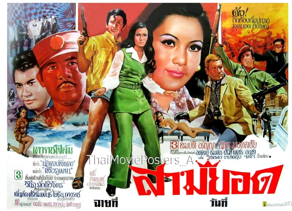 สามยอด (2513/1970) ข้อความบนใบปิด เทวราชฟิล์ม เสนผลงานเด่นในรอบปี... ดีกว่า...”นักเลงสี่แคว” แน่กว่า...”เสือภุพาน” สามยอด ดัง! กึกก้อง กัมปนาท สุดยอด ยิ่งใหญ่ 3 ทีมผู้สร้างที่เชื่อถือได้ รับรองคุณภาพ วินิจ ภักดีวิจิตร กำกับการแสดง สันทัด ศรีสัมพันธ์ ถ่ายภาพ โยธิน เทวราช อำนวยการสร้าง 3 ผู้ประพันธ์ อรชร, เพชร สถาบัน, นัทที เจษฎา 3 ดาราเด่น (แอ๊ด สมบัติ เมทะนี) (เปี๊ยก อรัญญา นามวงศ์) ฉัตร มงคลชัย ร่วมด้วยดาราชั้นนำคับคั่ง (อดุลย์ ดุลยรัตน์), (ชุมพร เทพพิทักษ์), ปริม ประภาพร, เพชร พิษณุ, อนุชา รัตนมาลย์ และใจดาว บุษยา, หยาดรุ้ง ระพี ฯลฯ นำแสดง เสรีภาพยนตร์ จัดจำหน่าย