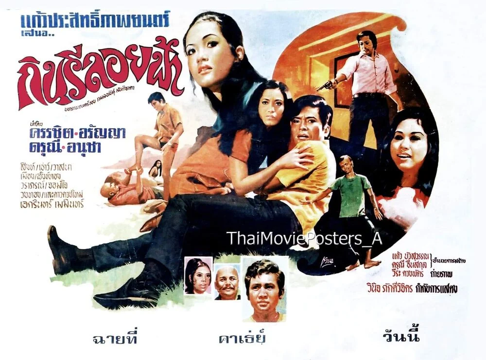 กินรีลอยฟ้า (2515/1972) ข้อความบนใบปิด แก้วประสิทธิ์ภาพยนตร์ เสนอ.. กินรีลอยฟ้า บทภาพยนตร์ของ กมลพันธุ์ สันติธาดา นำโดย (ครรชิต ขวัญประชา) (เปี๊ยก อรัญญา นามวงศ์) ดรุณี ชื่นสกุล อนุชา รัตนมาลย์ สิงห์ มิลินทราศัย, เชาว์ แคล่วคล่อง, วาสนา ชลากร, เมือง อพอลโล่, สังข์ทอง สีใส, วราภรณ์, จอมใจ จรินทร์, วงทอง ผลานุสนธิ์ และดาวดวงใหม่ เอกรินทร์ เมฆินทร์ แก้ว บัวสุวรรณ-ดรุณี ชื่นสกุล อำนวยการสร้าง วีระ ดวงพัตรา ถ่ายภาพ วินิจ ภักดีวิจิตร กำกับการแสดง