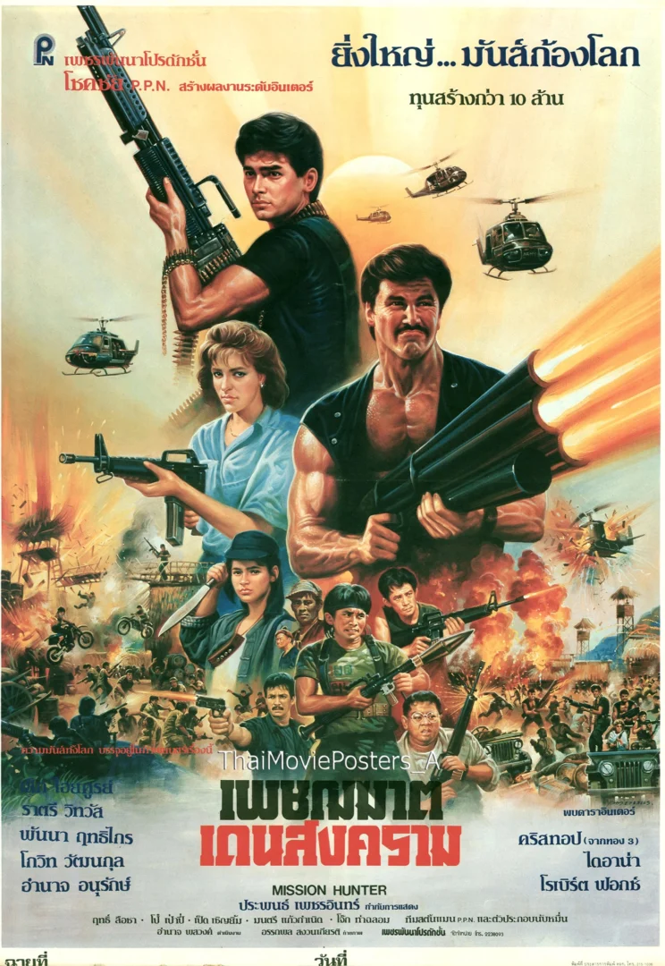 เพชฌฆาตเดนสงคราม (2531/1988) ข้อความบนใบปิด เพชรพันนาโปรดักชั่น โชคชัย P.P.N. สร้างผลงานระดับอินเตอร์ ยิ่งใหญ่..มันส์ก้องโลก ทุนสร้างกว่า 10 ล้าน ความมันส์ทั้งโลก บรรจุอยู่ในภาพยนตร์เรื่องนี้ เพชฌฆาตเดนสงคราม MISSION HUNTER ประพนธ์ เพชรอินทร์ กำกับการแสดง เล็ก ไอยศูรย์ ราตรี วิทวัส พันนา ฤทธิไกร โกวิท วัฒนกุล อำนาจ อนุรักษ์ พบดาราอินเตอร์ คริสทอป (จากทอง 3) ไดอาน่า โรเบิร์ต ฟอกซ์ ฤทธิ์ ลือชา, โป๋ เป่าปี่, เป็ด เชิญยิ้ม, มนตรี แก้วกำเนิด, โจ๊ก ท่าฉลอม, ทีมสตั๊นแมน P.P.N. และตัวประกอบนับหมื่น อำนาจ พสวงศ์ ดำเนินงาน อรรถพล สงวนเกียรติ ถ่ายภาพ เพชรพันนาโปรดักชั่น จัดจำหน่าย