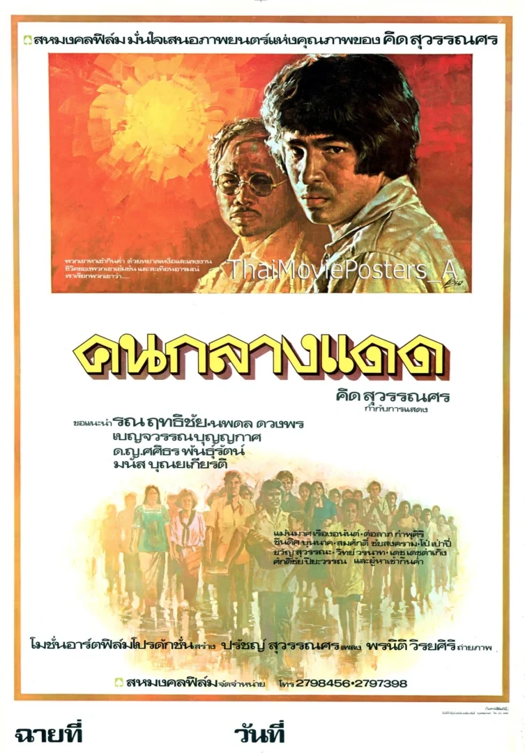 คนกลางแดด (2522/1979) ข้อความบนใบปิด สหมงคลฟิล์ม มั่นใจเสนอภาพยนตร์แห่งคุณภาพของ... คิด สุวรรณศร คนกลางแดด พวกเขาหาเช้ากินค่ำ ด้วยหยาดเหงื่อและแรงงาน ชีวิตของพวกเขาเข้มข้น และะเทือนอารมณ์ เราเรียกพวกเขาว่า...คนกลางแดด โมชั่นอาร์ตฟิล์มโปรดักชั่น สร้าง ขอแนะนำ รณ ฤทธิชัย นพดล ดวงพร เบญจวรรณ บุญญากาศ ด.ญ.ศศิธร พันธุ์รัตน์ (มนัส บุณยเกียรติ) แม้นมาศ เรืองอนันต์, ต่อลาภ กำพุศิริ, ชินดิศ บุนนาค, (สมศักดิ์ ชัยสงคราม), โป๋ เป่าปี่, ขวัญ สุวรรณะ, วิทย์ วรนาท, เดช เดชดำเกิง, ศักดิ์ชัย ปิยะวรรณ และ ผู้หาเช้ากินค่ำ คิด สุวรรณศร กำกับการแสดง ปรัชญ์ สุวรรณศร เพลง พรนิติ วิริยศิริ ถ่ายภาพ สหมงคลฟิล์ม จัดจำหน่าย