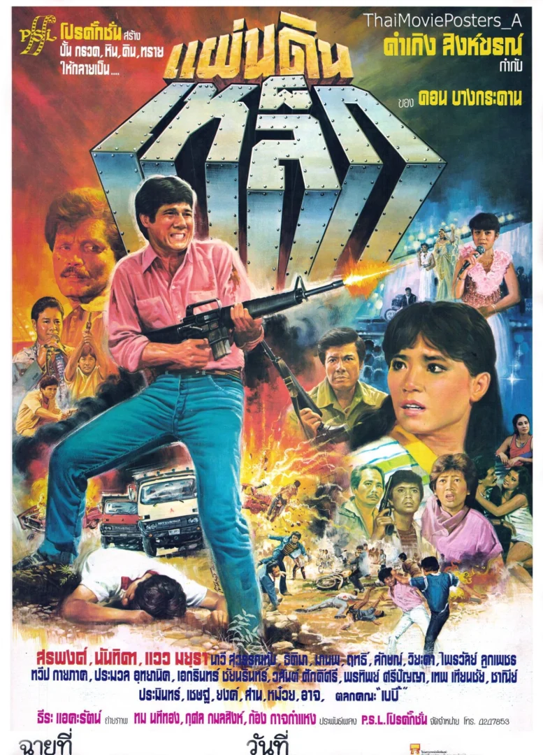 แผ่นดินเหล็ก (2526/1983) ข้อความบนใบปิด PSL โปรดักชั่น สร้าง ปั้น กรวด, หิน, ดิน, ทราย ให้กลายเป็น... แผ่นดินเหล็ก ของ ดอน บางกระดาน ดำเกิง สิงห์ขรณ์ กำกับการแสดง สรพงศ์ ชาตรี นันทิดา แก้วบัวสาย แวว มยุรา นาวี สุวรรณทับ, (ธิติมา สังขพิทักษ์), (มานพ อัศวเทพ), ฤทธิ์ ลือชา, ลักษณ์ อภิชาติ, วิยะดา อุมารินทร์, ไพรวัลย์ ลูกเพชร, ทวีป กายภาค, ประมวล อุทยานิค, เอกรินทร์ ชัยนรินทร์, วสันต์ ศักดิ์ศรี, พรทิพย์ ศรีปัญญา, เทพ เทียนชัย, ชาณีย์ ยอดชัย, ประมินทร์, เชษฐ์, ยงค์, สาน, หม๋วย, อาจ, ตลกคณะ “เบบี้” ธีระ แอคะรัจน์ ถ่ายภาพ ทม นทีทอง, กุศล กมลสิงห์, ก้อง กาจกำแหง ประพันธ์เพลง P.S.L.โปรดักชั่น จัดจำหน่าย