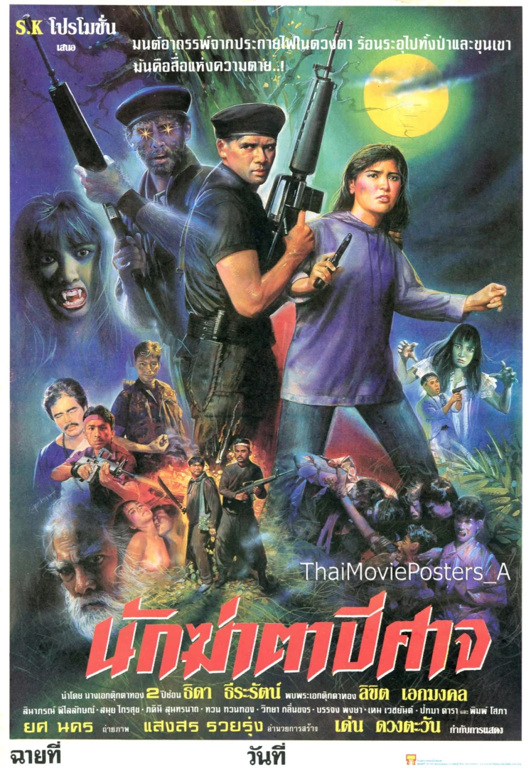 นักฆ่าตาปีศาจ (2537/1994) ข้อความบนใบปิด S.K.โปรโมชั่น เสนอ มนต์อาถรรพ์จากประกายไฟในดวงตา ร้อนระอุไปทั้งป่าและขุนเขา มันคือสื่อแห่งความตาย! นักฆ่าตาปีศาจ นำโดย นางเอกตุ๊กตาทอง 2 ปีซ้อน ธิดา ธีระรัตน์ พบพระเอกตุ๊กตาทอง ลิขิต เอกมงคล สินาภรณ์ พิไลลักษณ์, สมุย ไกรสุข, ภคินี สุนทรนาถ, ทวน ทวนทอง, วิทยา กลิ่นขจร, บรรจง พงษา, เหม เวชยันต์, ปัทมา ดารา และพิมพ์ โสภา ยศ นคร ถ่ายภาพ แสงสร รวยรุ่ง อำนวยการสร้าง เด่น ดวงตะวัน กำกับการแสดง